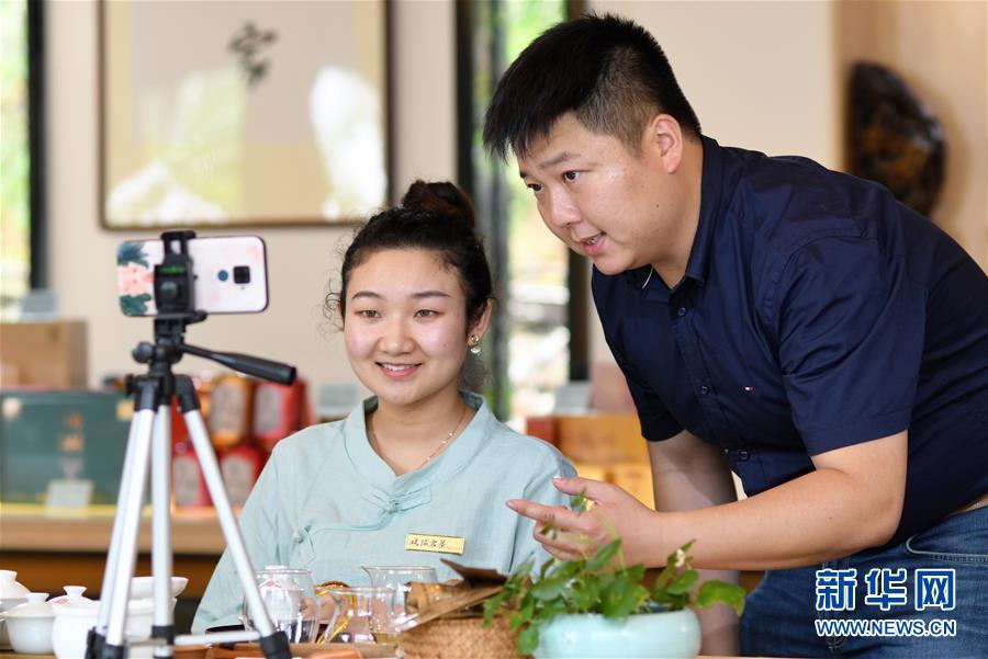 方舟(右)在指导公司员工使用电商平台直播销售武夷岩茶(5月10日摄)。新华社记者魏培全摄