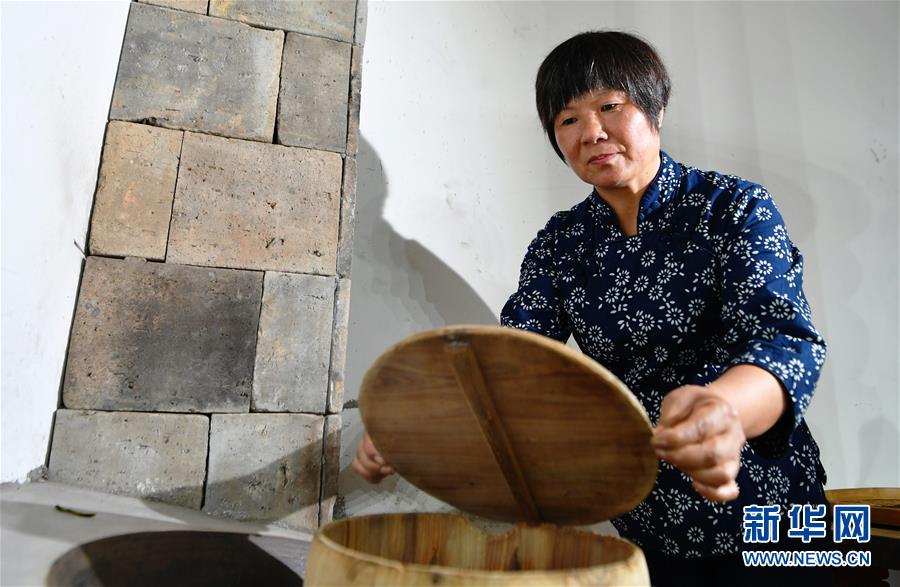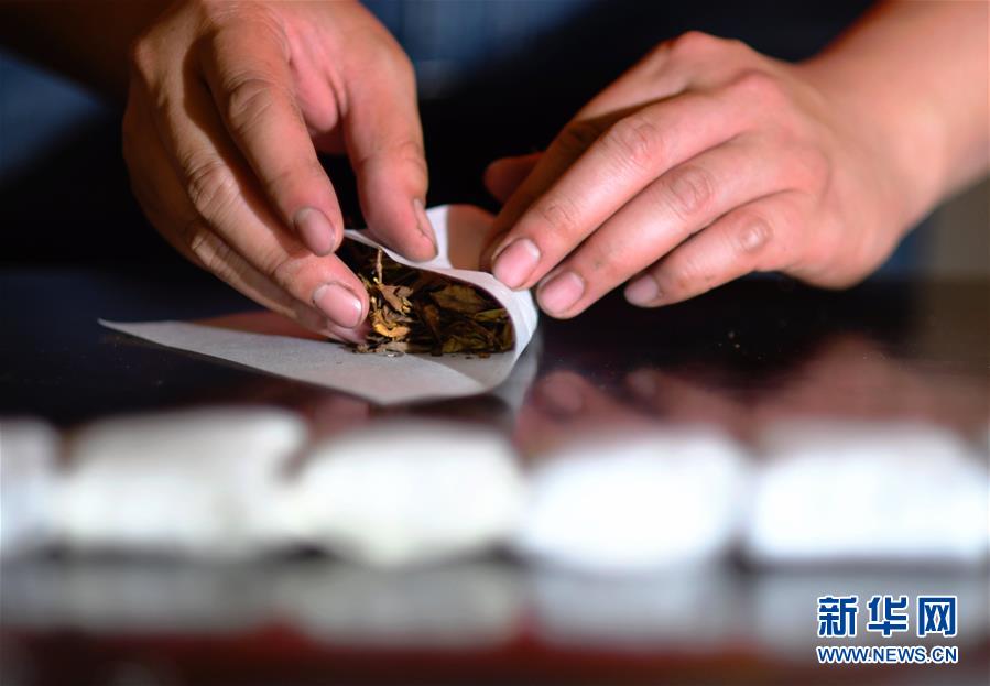 方舟在对新研发出的白鸡冠茶用传统绵纸进行紧压包装(5月10日摄)。新华社记者魏培全摄