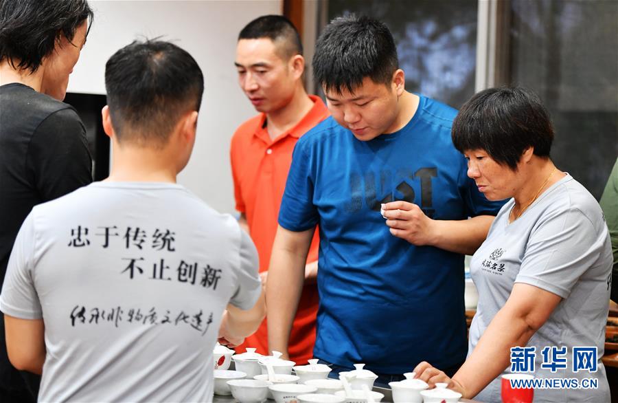 游玉琼(右一)带着儿子方舟(右二)和公司制茶师傅们一起审评毛茶(5月9日摄)。新华社记者魏培全摄