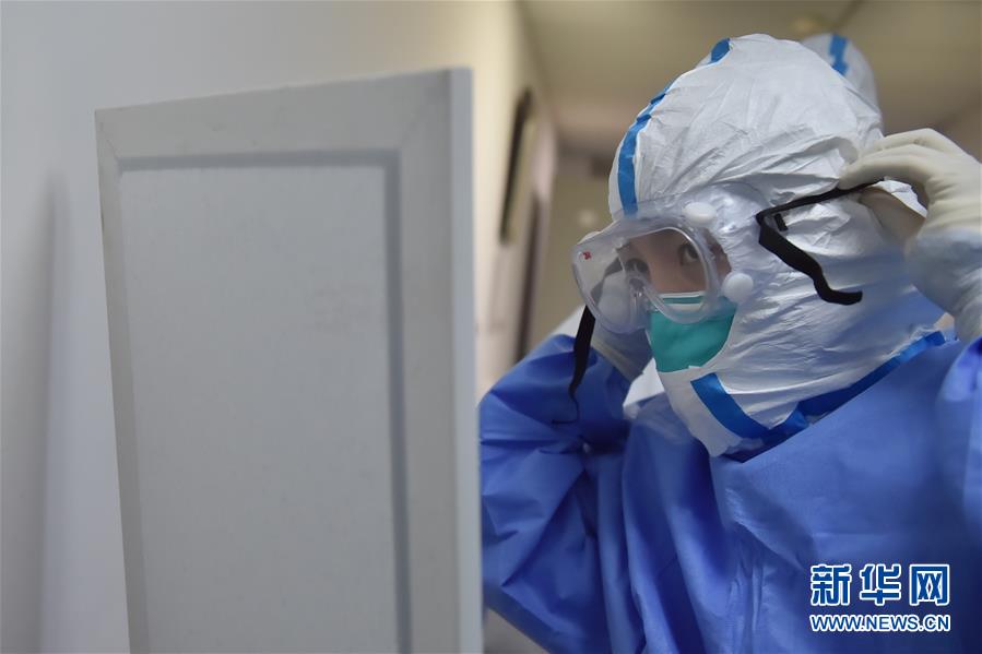 5月11日,在北京地坛医院感染二科病房外,护士刘印怀穿戴防护设备准备进入病房。北京地坛医院是北京市收治新冠肺炎患者的定点医院之一,医院的医护人员一直奋战在抗击疫情的一线。在国际护士节前夕,记者前往北京地坛医院,记录下抗疫一线护士的日常工作状态。新华社记者彭子洋摄