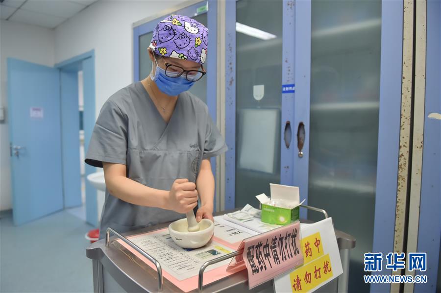 5月11日,在北京地坛医院感染二科护士站,一名护士为不方便服药的病人研磨药片。北京地坛医院是北京市收治新冠肺炎患者的定点医院之一,医院的医护人员一直奋战在抗击疫情的一线。在国际护士节前夕,记者前往北京地坛医院,记录下抗疫一线护士的日常工作状态。新华社记者彭子洋摄
