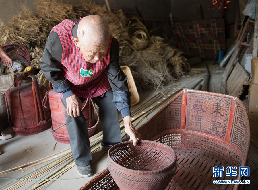 5月12日,浙江诸暨龙溪村的百岁老人蔡渭东在家中展示自己早年做的农村婚事用的篾器。浙江诸暨东和乡龙溪村有一位102岁的老人蔡渭东,他从12岁开始拜师学艺,做了90年的篾匠,如今依然耳聪目明,每天坚持编织篾器。蔡渭东老人说他舍不得丢掉这份老手艺,也希望年轻人能传承下去。新华社记者翁忻旸摄