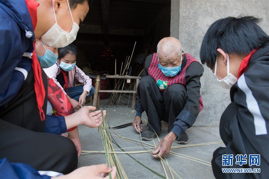 5月12日,浙江诸暨龙溪村的百岁老人蔡渭东在家中为小学生讲解篾器编法。浙江诸暨东和乡龙溪村有一位102岁的老人蔡渭东,他从12岁开始拜师学艺,做了90年的篾匠,如今依然耳聪目明,每天坚持编织篾器。蔡渭东老人说他舍不得丢掉这份老手艺,也希望年轻人能传承下去。新华社记者翁忻旸摄