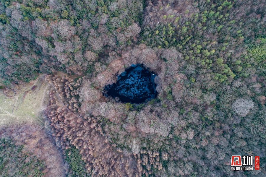 图为2019年3月11日,陕西汉中镇巴县三元镇天坑,坑口形态呈近圆形,最大口径110米,最大坑深150米。