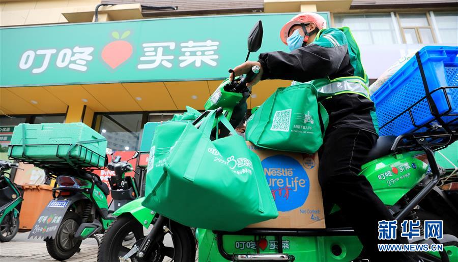 一名外送员从叮咚买菜上海浦东云山路前置仓出发送货(4月17日摄)。新华社记者方喆摄