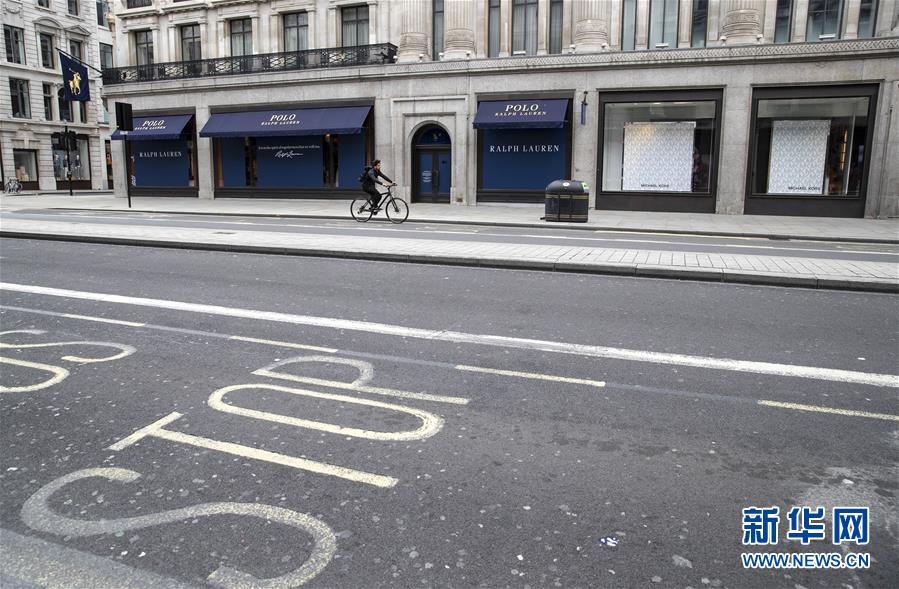 5月12日,在英国伦敦,一名男子骑行经过摄政街关闭的店铺。新华社记者韩岩摄