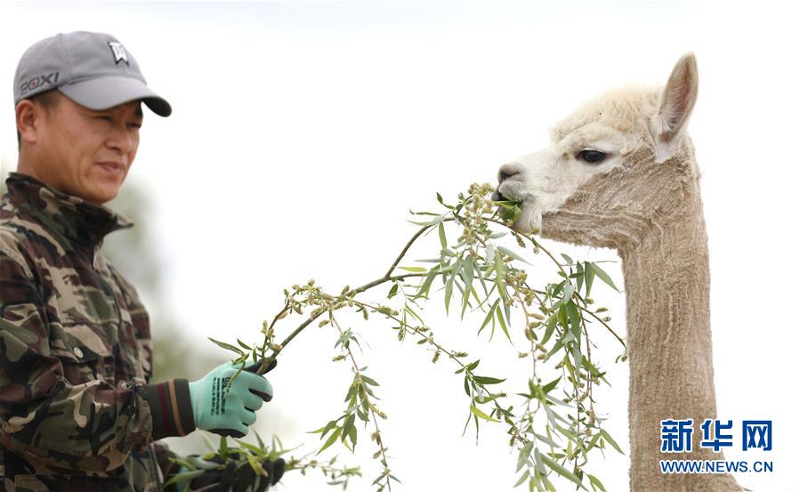 5月12日,饲养员在喂食一只剪下绒毛的羊驼。新华社记者姚剑锋摄