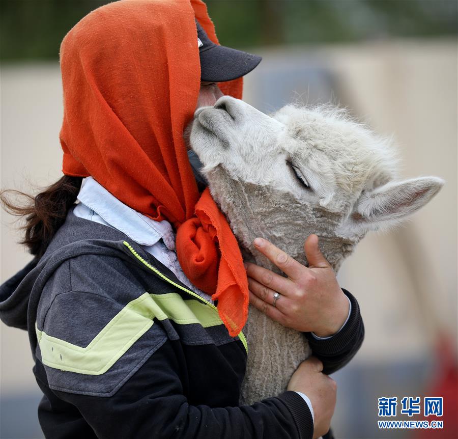 5月12日,一只剪下绒毛的羊驼依偎在饲养员怀里。新华社记者姚剑锋摄