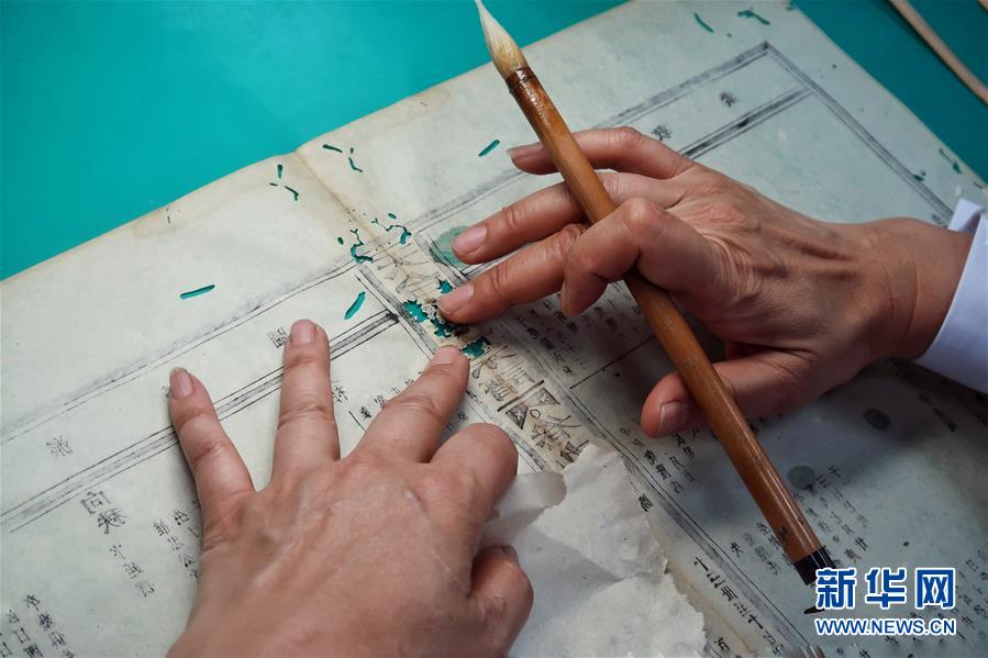 5月13日,天一阁藏品修复部主任王金玉在对书页进行修复。天一阁藏品修复部目前有修复师14人,每年约修复古籍14000余页。据介绍,修复一册古籍通常需要1至2个月,有的甚至需要1年以上。新华社记者郑梦雨摄