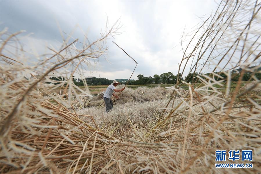 5月13日,在贵州省黔西县洪水镇解放村,村民在采收油菜籽。新华社记者杨楹摄