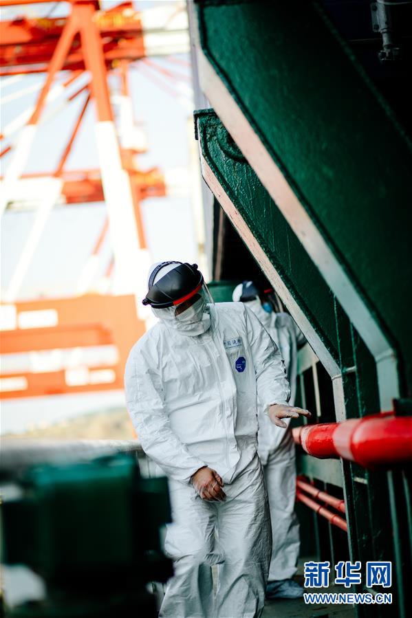 5月13日,山东威海出入境边防检查站民警登上国际集装箱货轮检查。新华社记者朱峥摄