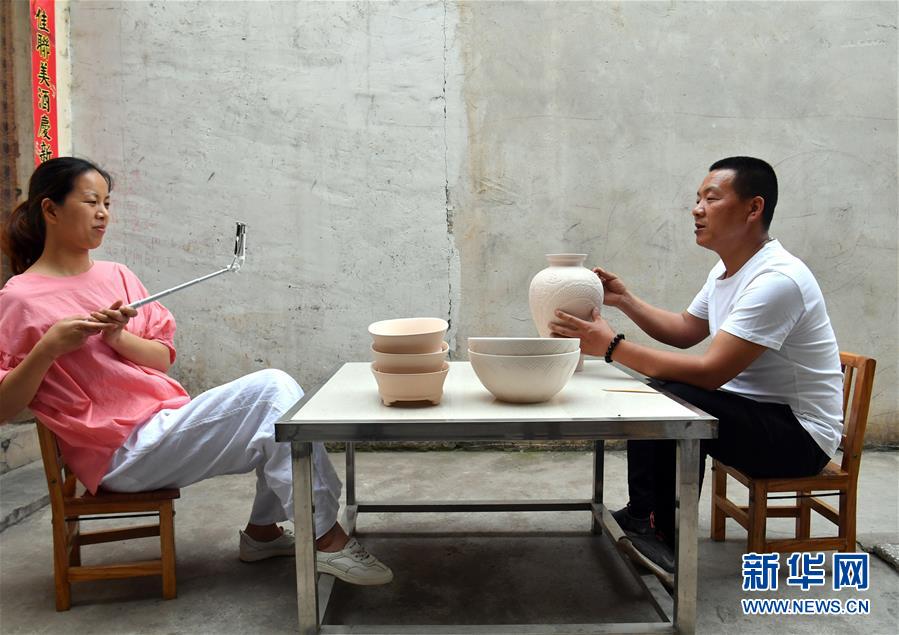 5月13日,宝丰县大营镇的汝瓷艺人宋召冰在汝瓷作坊直播介绍汝瓷产品。新华社记者李嘉南摄