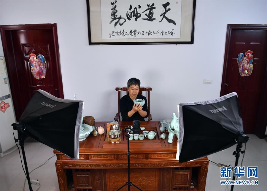5月13日,宝丰县大营镇的汝瓷艺人王国奇在拍摄汝瓷产品短视频。新华社记者李嘉南摄