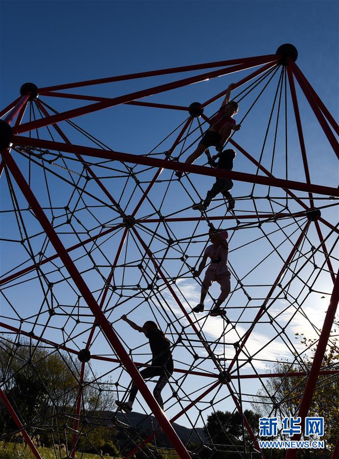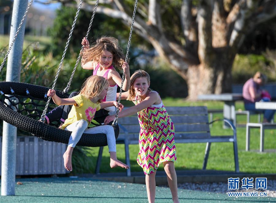 5月14日,孩子们在首都惠灵顿郊外公园的游乐场玩耍。当天是新西兰从新冠疫情防控响应三级下调到二级的第一天,经济活动全面重启,公园等公共设施首次重新开放,中小学生将于5月18日全面返校复课。新华社记者郭磊摄