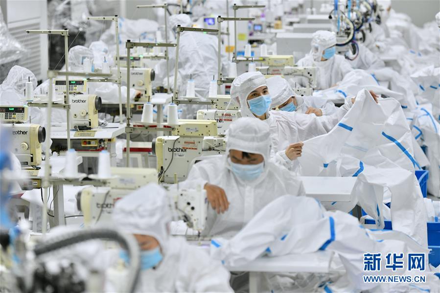在福建晋江,工人在生产防护服(2月4日摄)。新华社记者姜克红摄