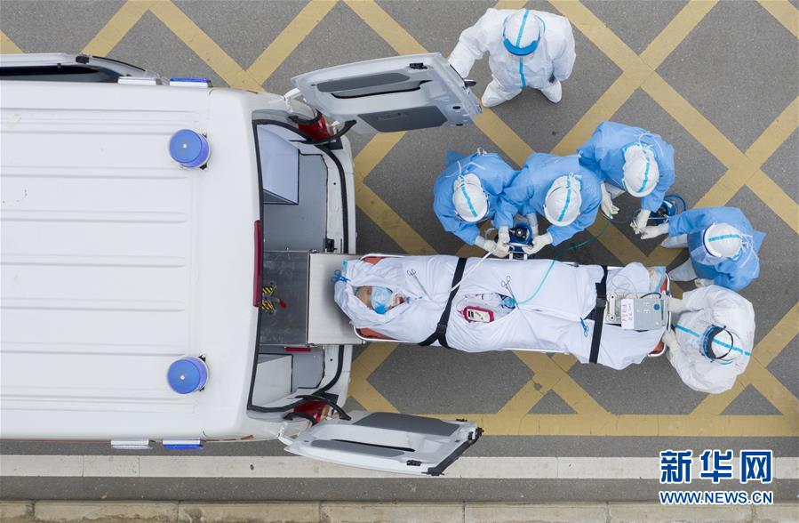 在华中科技大学附属同济医院中法新城院区,医护人员护送一名刚做完CT检查的新冠肺炎重症患者上负压救护车(3月6日摄,无人机照片)。新华社记者才扬摄