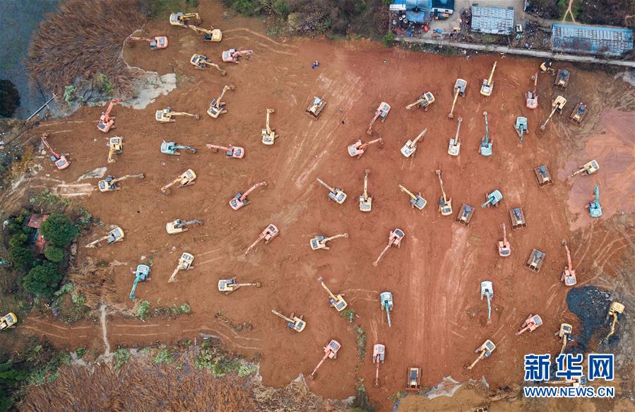 大型机械在武汉火神山医院建设工地施工(1月24日摄,无人机照片)。新华社记者肖艺九摄