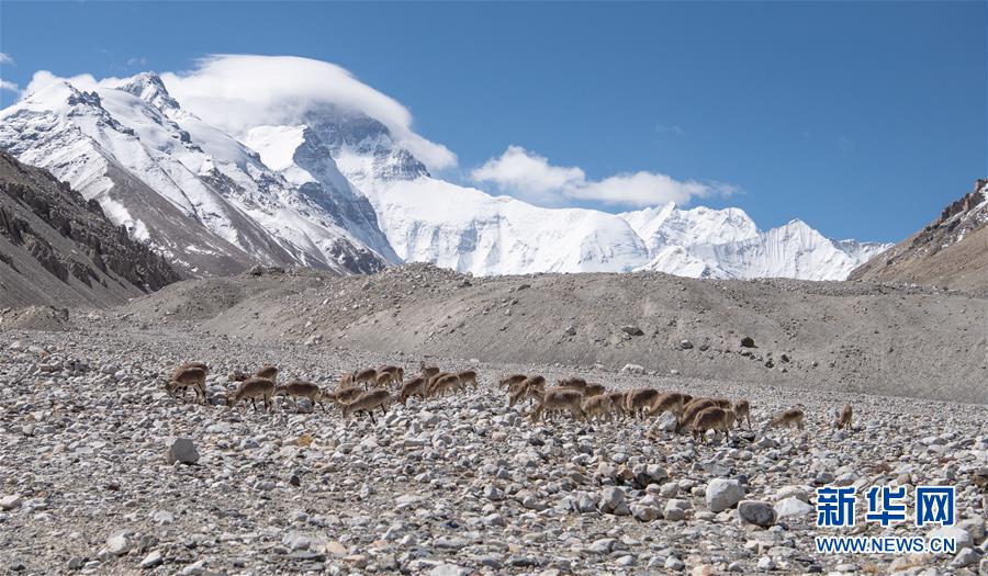 栖息在珠穆朗玛峰国家级自然保护区内的岩羊(5月8日摄)。新华社记者晋美多吉摄