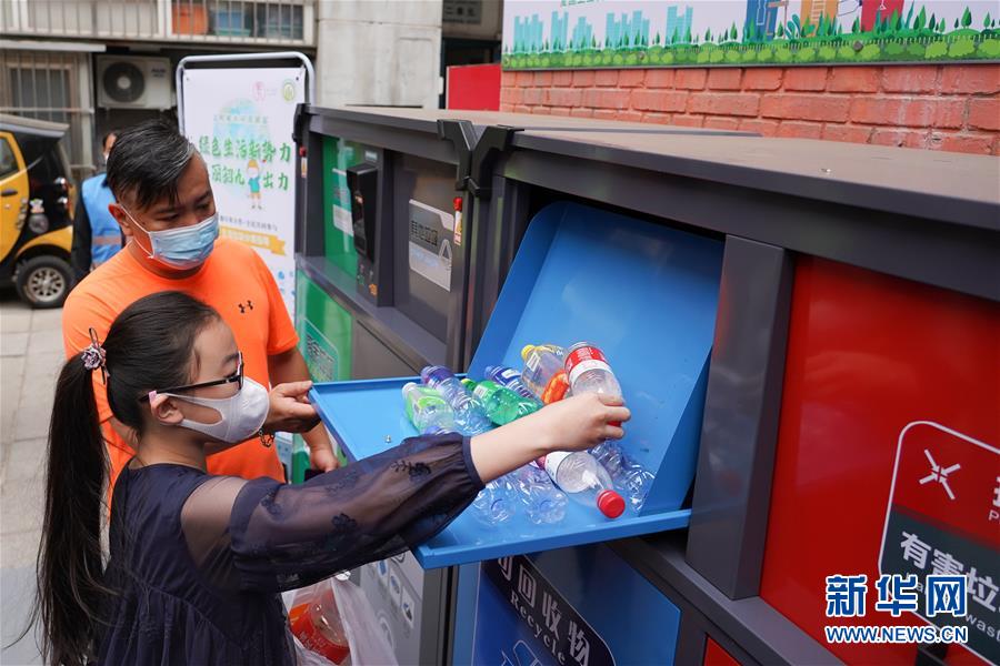 5月17日,在东华门街道韶九社区,小朋友将塑料瓶投放到四分类智能垃圾桶内。新华社记者鞠焕宗摄