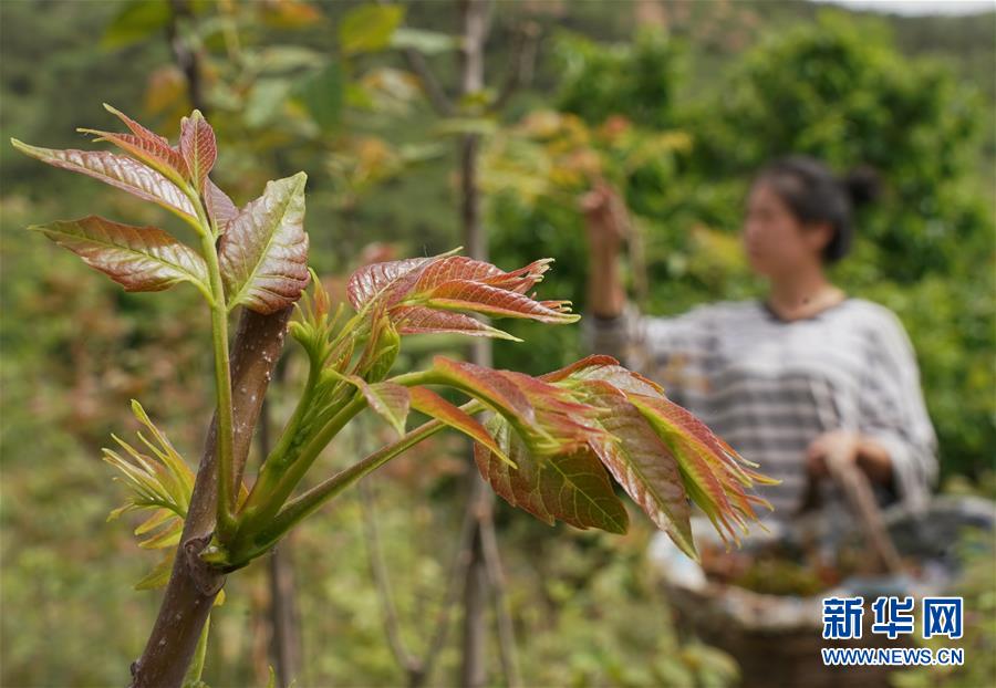 5月17日,秦皇岛市抚宁区王家湾村的一位村民在自家香椿园采摘香椿芽。近年来,河北省秦皇岛市抚宁区王家湾村村委会带领村民在坡岭荒地种植红香椿树1000多亩,绿化了荒坡荒地,增加了农民收入。新华社记者杨世尧摄