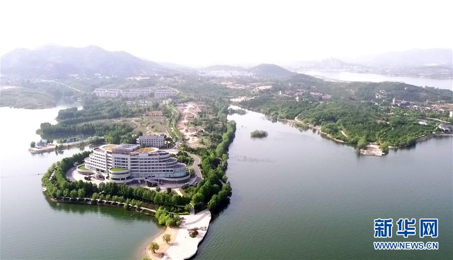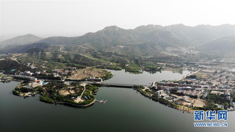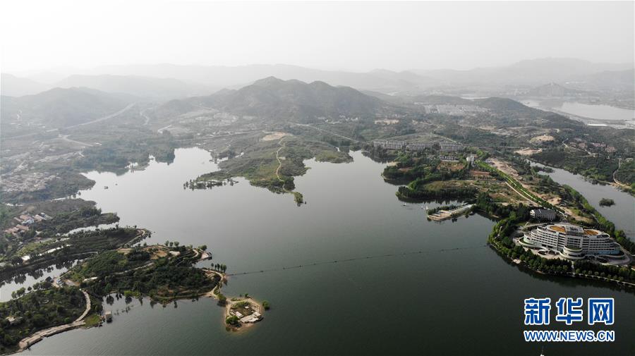 这是5月17日拍摄的雪野湖景色(无人机照片)。山东济南风景区——雪野湖波光粼粼,岸边绿树环抱,加上星星点点的帆船在湖面摇曳,景色宜人。新华社记者王凯摄