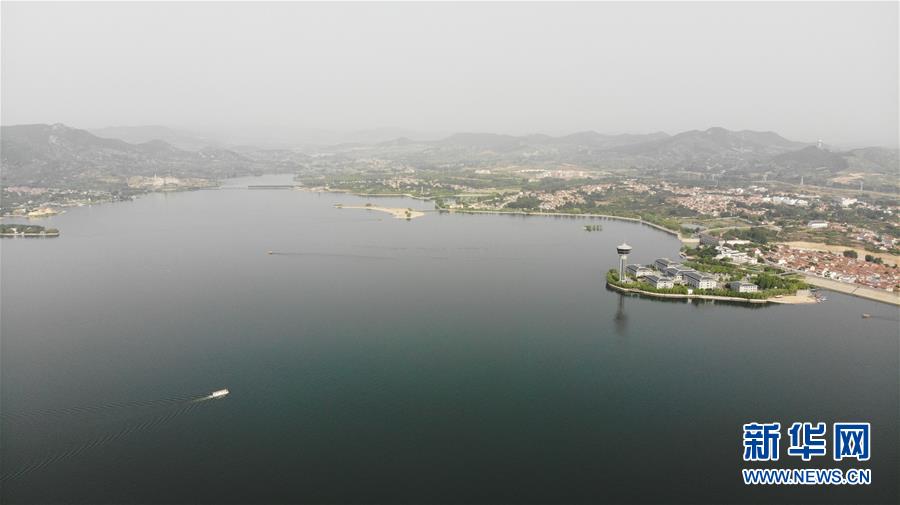 这是5月17日拍摄的雪野湖景色(无人机照片)。山东济南风景区——雪野湖波光粼粼,岸边绿树环抱,加上星星点点的帆船在湖面摇曳,景色宜人。新华社记者王凯摄