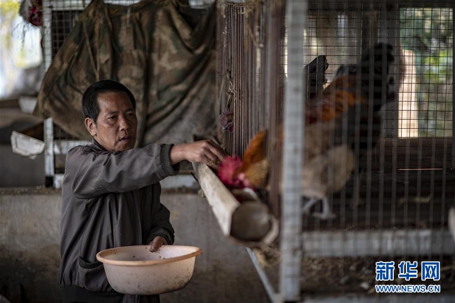 村民王九才在村里统一修建的鸡舍里喂鸡(3月28日摄)。新华社记者江文耀摄