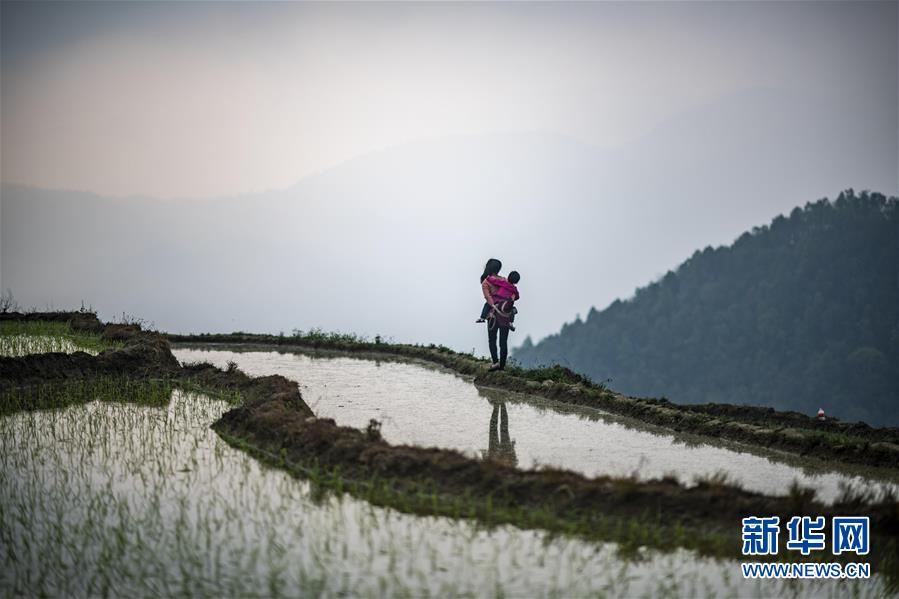 一名妇女背着孩子准备去田里劳作(3月26日摄)。新华社记者江文耀摄
