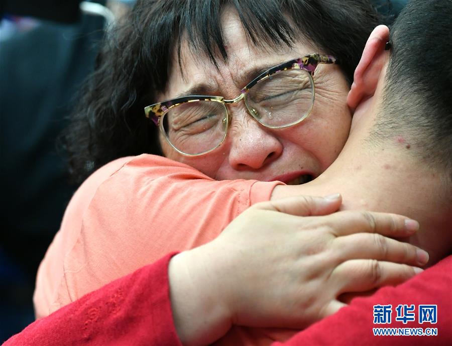5月18日,李静芝(左)与失散32年的儿子毛寅团聚时落泪。新华社记者张博文摄