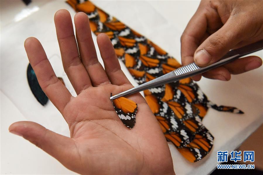 在吉木萨尔县七彩蝶园,关富云在制作蝶翅画(5月14日摄)。新华社记者丁磊摄