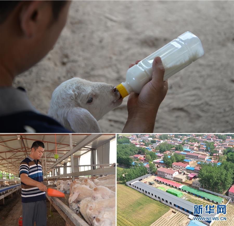 这是一张拼版照片(图片均为5月16日摄)。上图:在河南省开封市尉氏县大桥乡岗刘村,34岁的丁懿军在给小羊喂奶;下左图:丁懿军在给羊喂食;下右图:在扶贫政策扶持下,丁懿军在村头建了占地8亩的羊养殖场,现养羊800多只(无人机照片)。新华社记者孙清清摄