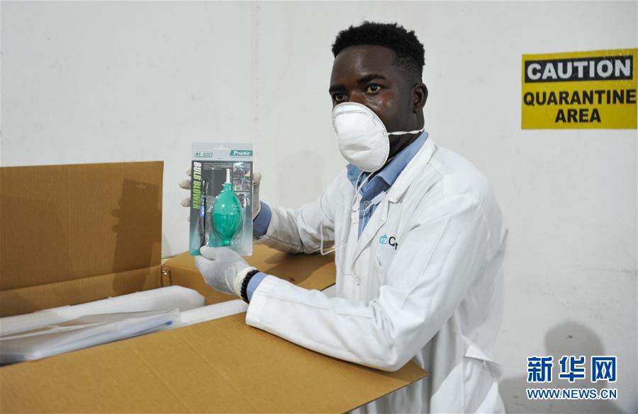 在加纳首都阿克拉,加纳最大的连锁药品供应商mPharma的工作人员整理从中国湖南圣湘生物科技股份有限公司进口的检测设备(2020年5月6日摄)。新华社记者许正摄