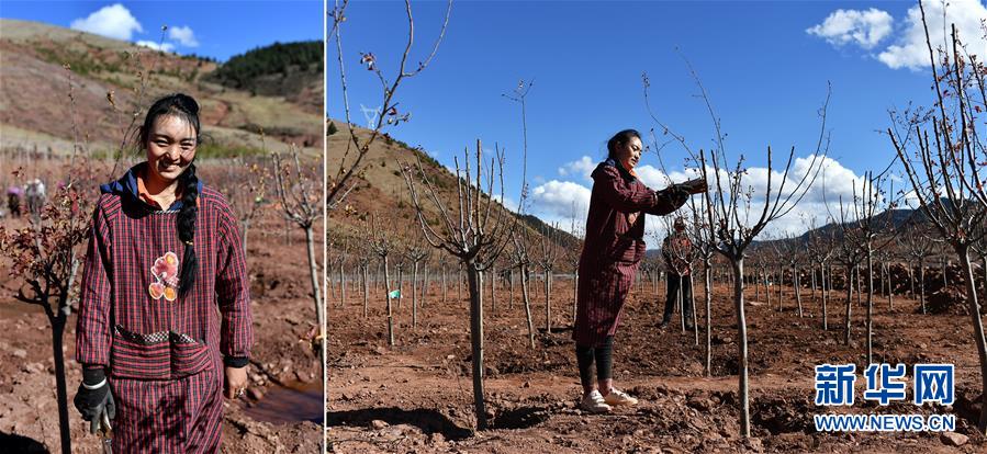拼版照片:左图为西藏昌都市芒康县帮达乡毛尼村村民拉姆卓玛;右图为拉姆卓玛在芒康县林业产业扶贫苗圃基地忙碌。2020年,经朋友介绍,拉姆卓玛来到苗圃基地打工,每天有120元的收入。苗圃基地还吸纳了附近易地扶贫搬迁安置点的80多名群众稳定就业(5月5日摄)。新华社记者詹彦摄