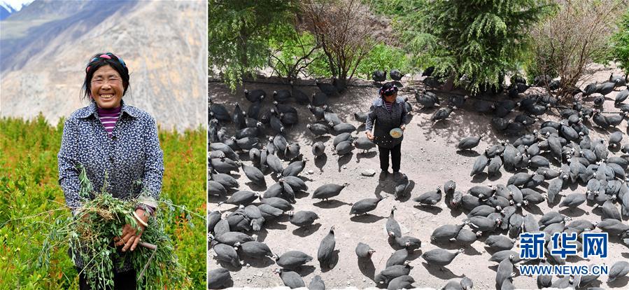 拼版照片:左图为西藏昌都市芒康县纳西民族乡加达村村民白姆;右图为白姆在芒康县纳西民族乡三江农民专业合作社喂鸡。白姆在三江农民专业合作社打工,主要负责喂鸡和喂牛,每月有3000元的收入(5月4日摄)。新华社记者詹彦摄