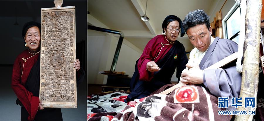 拼版照片:左图为西藏昌都市江达县波罗乡外冲村村民泽培;右图为在江达县波罗乡木松民族手工艺有限责任公司,泽培(左)在指导学生。泽培是当地著名的波罗木刻艺人,波罗木刻由于做工繁复,太消耗体能,收入不高,波罗木刻艺人的数量在过去几十年间急剧减少。为保护和传承波罗木刻,近年来,江达县成立了波罗乡木松民族手工艺有限责任公司。泽培招收了几十名学徒传授技艺,经过练习,学徒们已经成为熟练的木刻艺人,每人每月有4000多元的收入(5月1日摄)。新华社记者詹彦摄
