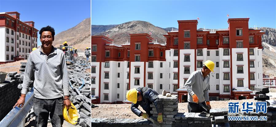 拼版照片:左图为西藏昌都市八宿县吉达乡仲沙村村民平措;右图为平措(右)在八宿县西巴易地扶贫搬迁安置点的工地上干活。2019年,平措和家人搬迁到西巴易地扶贫搬迁安置点,住进了75平方米的新居,平措还在安置点找到了一份建筑工的工作,每月有4000多元的收入。在此之前,平措靠在县城打零工挣钱(5月10日摄)。新华社记者詹彦摄