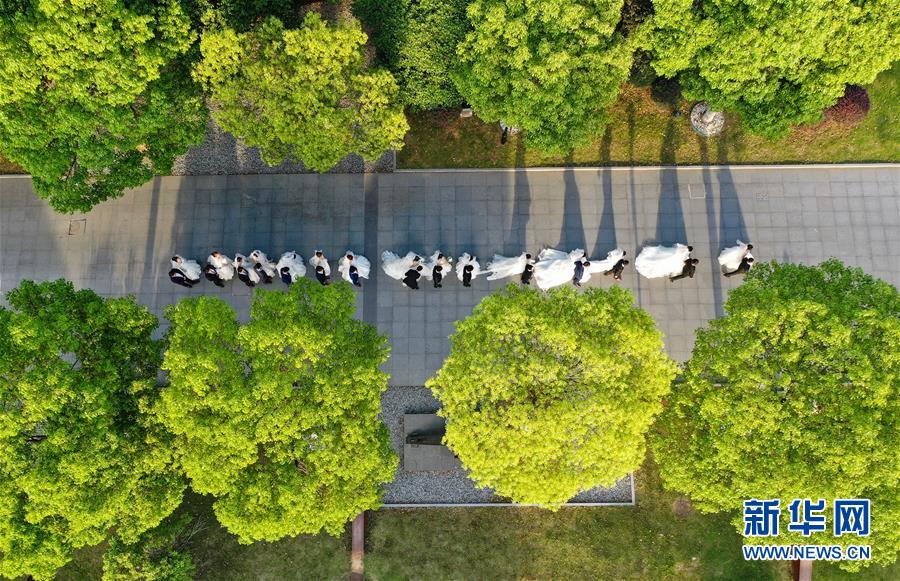 5月19日,新人们在拍摄婚纱照(无人机照片)。当日,15对新人在江苏南京集体拍摄婚纱照,并将参加5月20日在南京举行的“今世缘白衣天使集体婚礼”。拍摄婚纱照的部分新人此前因驰援武汉或参加所在城市抗疫工作而推迟婚期。新华社记者季春鹏摄
