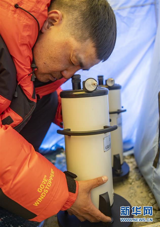 国测一大队队员在珠峰大本营测试地面测量中使用的重力仪(5月3日摄)。新华社记者晋美多吉摄
