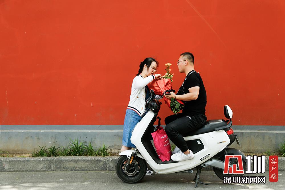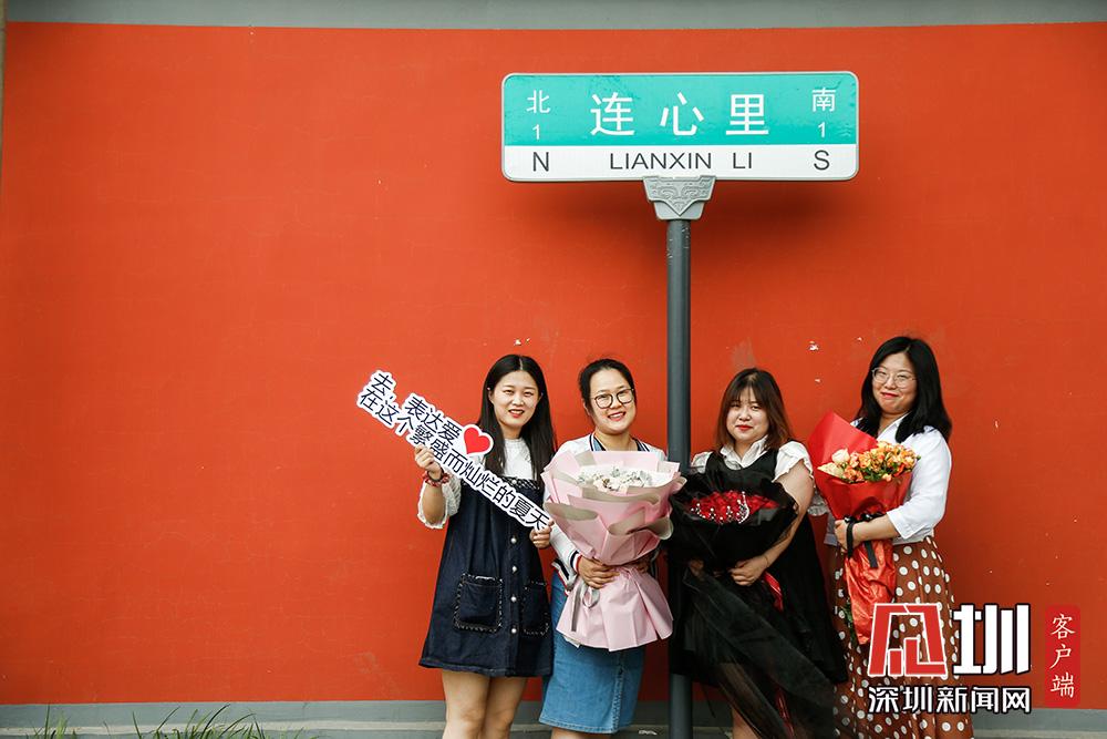 不过,在5月20日当天来这里拍照的情侣或夫妻并不多,反倒有众多“单身狗”与同性闺蜜一起,在“连心里”的路牌下、红墙边,手捧鲜花拍照打卡。