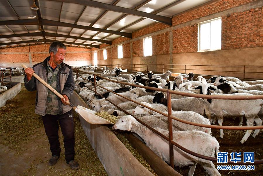 宋家沟村村民贺毛小在养殖合作社内喂羊(5月19日摄)。新华社记者曹阳摄