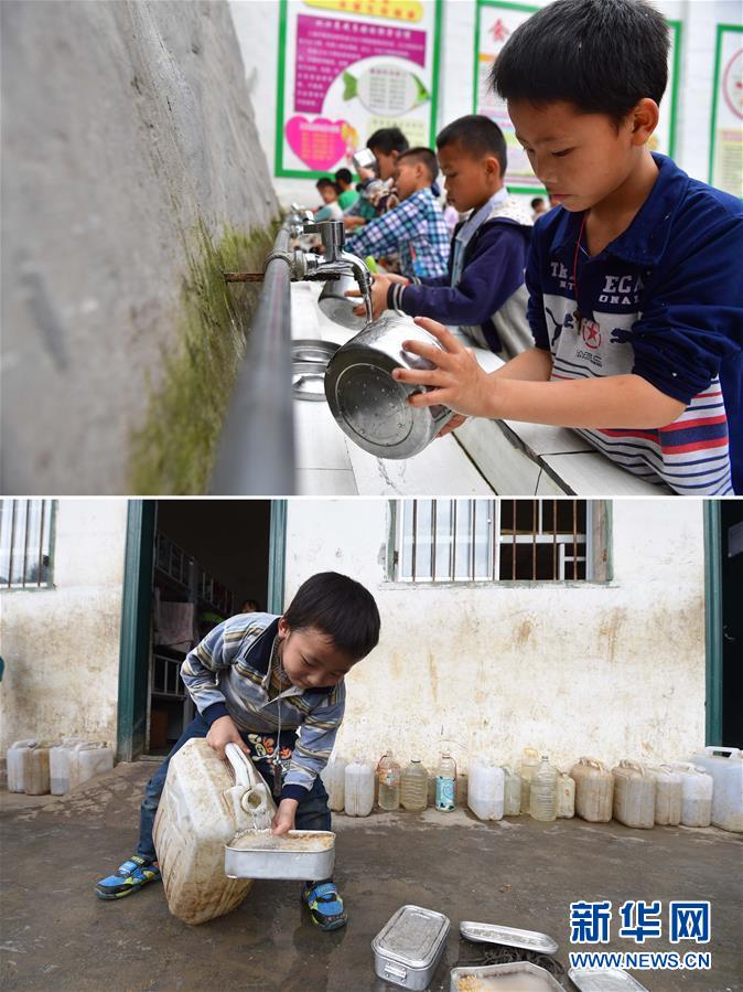 这是一张拼版照片。上图:在大化瑶族自治县板升乡八好小学,同学们在用泉水洗碗(2019年5月7日摄)。下图:八好小学的同学们用储备在水桶里的雨水淘米煮饭(2014年11月24日摄)。八好小学有400多名学生,曾仅有一个不足100立方米的水柜,用于收集储存楼顶的雨水,学生需定期定量用水。遇到长时间不下雨,学校需要到乡政府所在地运水。如今,学校修建了5个大水柜,并从两公里外引泉水到校园,“饮水难”问题得到解决。新华社记者黄孝邦摄
