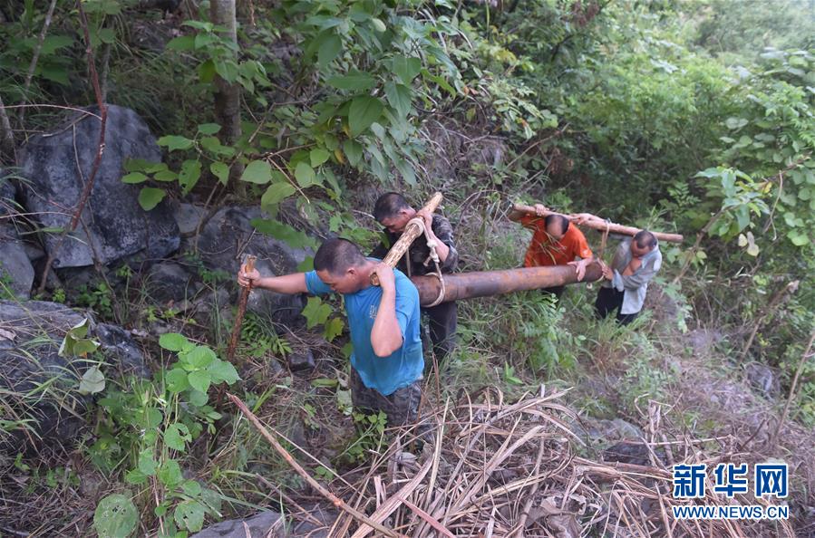 在广西大化瑶族自治县板升乡弄雷村,工人们抬着抗旱饮水工程的水管在山路上前行(2016年8月18日摄)。新华社记者黄孝邦摄