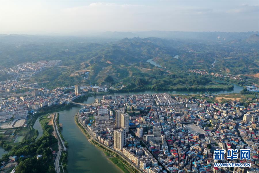 这是广西环江毛南族自治县县城风貌(5月14日摄,无人机照片)。毛南族是我国28个人口较少民族之一,广西壮族自治区环江县是国家扶贫开发工作重点县,也是全国唯一的毛南族自治县,全县有毛南族6.45万人,占全国毛南族总人口的约70%。2019年底,环江县贫困发生率降至1.48%。2020年5月,环江县退出贫困县序列。综合全国毛南族脱贫情况,毛南族已实现整族脱贫。新华社记者陆波岸摄