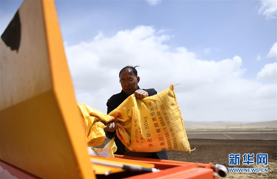 在青海省海北藏族自治州海晏县青海湖乡同宝村,者成仓准备播种(5月13日摄)。新华社记者张宏祥摄