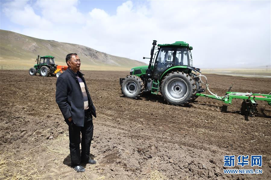 在青海省海北藏族自治州海晏县青海湖乡同宝村,者成仓在地里查看播种进度(5月13日摄)。新华社记者张宏祥摄