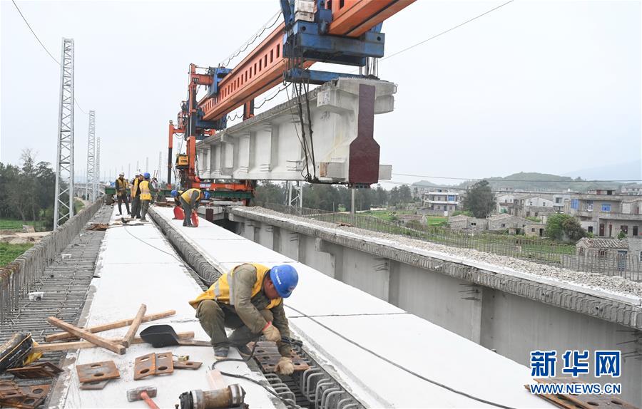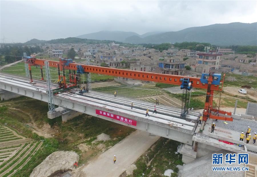 5月20日,福平铁路洋中特大桥最后一片T型梁在架设中。新华社记者林善传摄