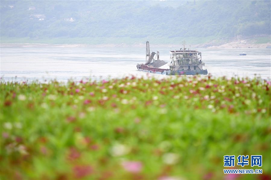5月20日,在重庆市巴南区木洞镇开满格桑花的长江岸边,远处航道上一艘轮船缓缓驶过。近日,重庆市巴南区木洞镇长江岸边的格桑花竞相开放,吸引游客前来赏花观景。新华社记者唐奕摄