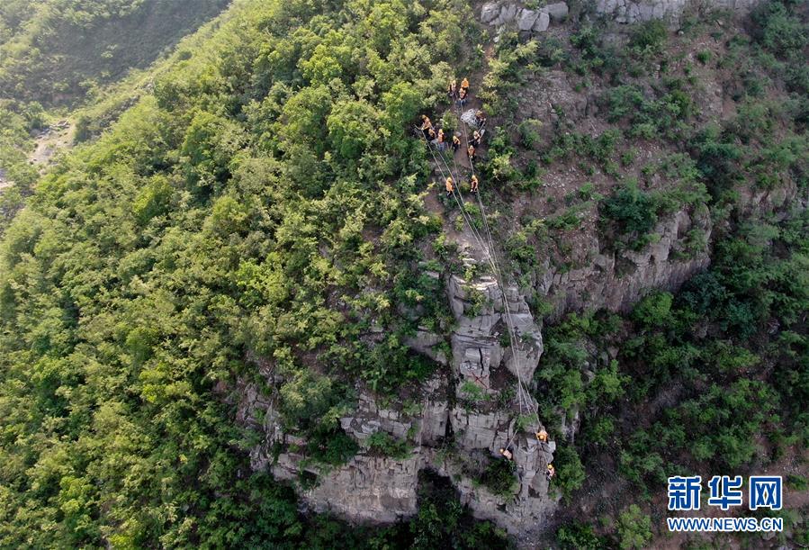 5月21日,捅山工胡军从山顶垂降,准备开始捅山作业。新华社记者郝源摄