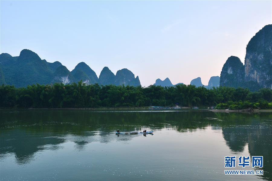 这是在广西桂林市阳朔县兴坪镇拍摄的山水风光(5月21日摄,无人机全景照片)。“苍苍森八桂,兹地在湘南。江作青罗带,山如碧玉篸……”一千多年前,唐朝诗人韩愈写尽桂林山水之美。初夏时节,在广西桂林市阳朔县兴坪镇,蓝天白云下,烟雨朦胧中,桂林山水尽显秀美。新华社记者周华摄