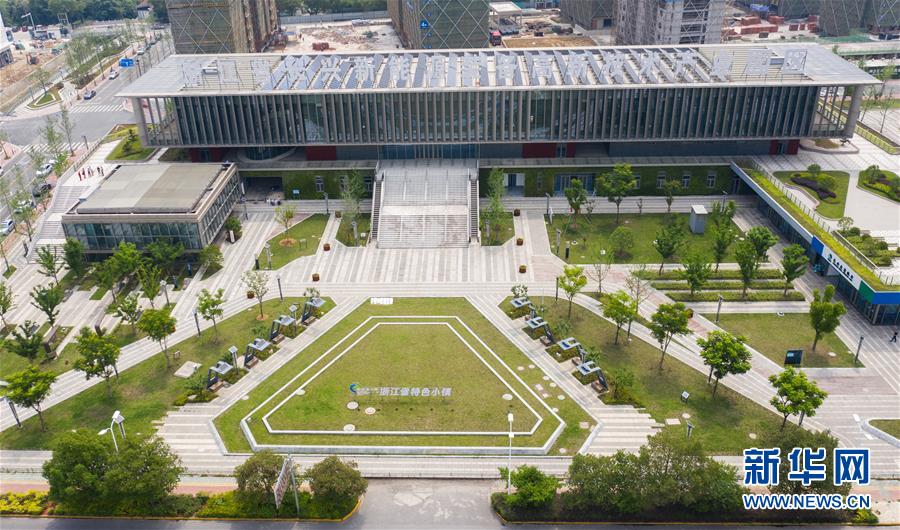 5月21日,空中俯瞰新能源小镇“城市客厅”(无人机照片)。城市客厅的屋顶和侧面都安装了可以开合、转动的光伏板,可以随时调整角度,控制采光和发电。